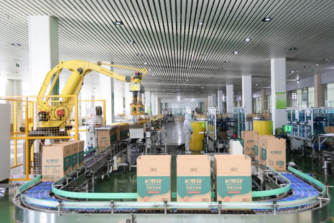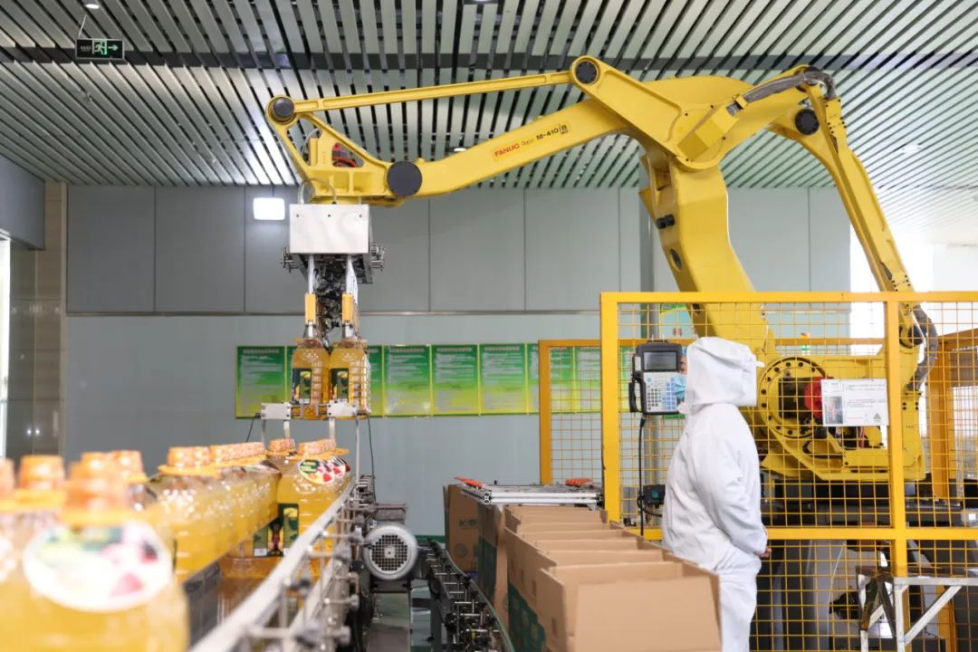 同樣,在長(zhǎng)壽花食品公司的車(chē)間內(nèi),也是一片熱火朝天的生產(chǎn)景象。全自動(dòng)生產(chǎn)線(xiàn)上,吹瓶、灌裝并封蓋、燈檢、貼標(biāo)簽等工序一氣呵成。最后,智能機(jī)械臂一次抓取12桶油,放進(jìn)3個(gè)包裝箱,封裝后傳送至倉(cāng)庫(kù)。