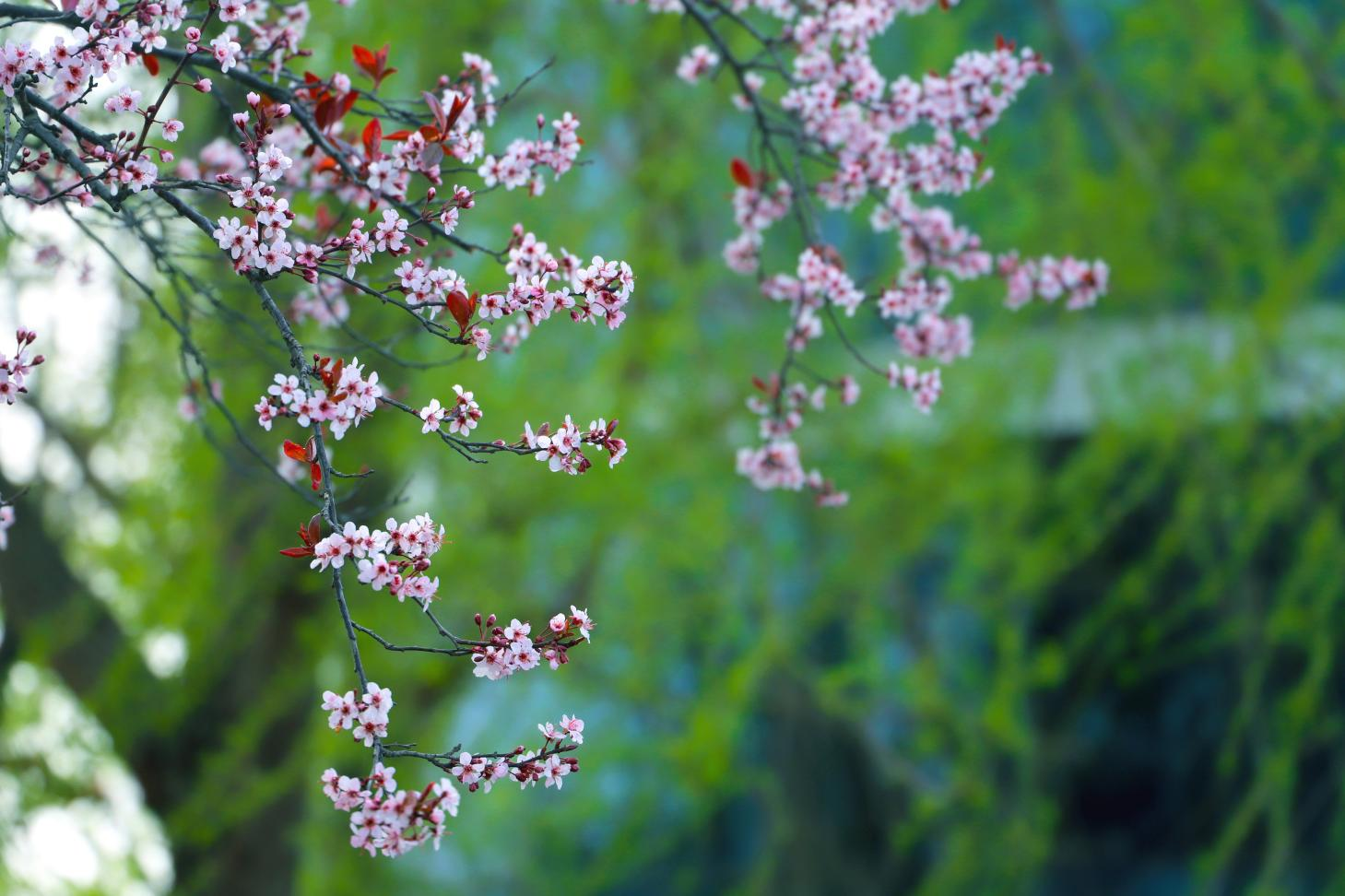 紫葉李成瀑,緋云墜地