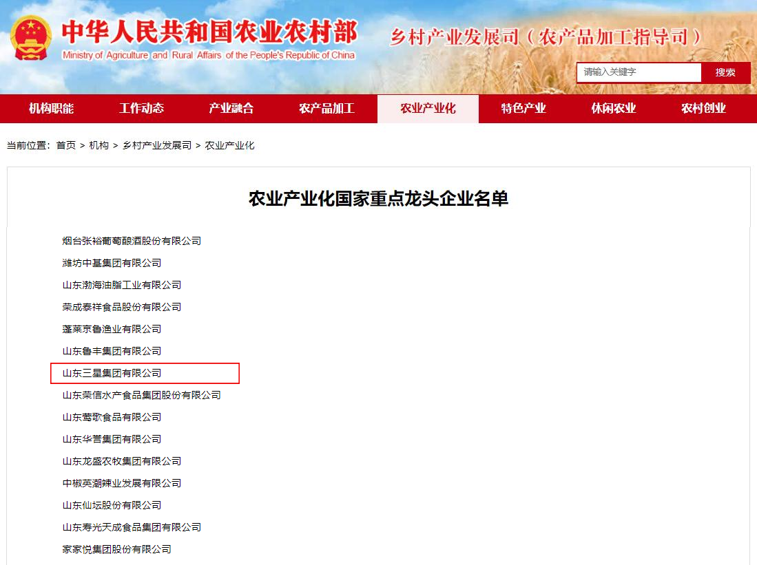 近日,農(nóng)業(yè)農(nóng)村部公布了新一批“農(nóng)業(yè)產(chǎn)業(yè)化國(guó)家重點(diǎn)龍頭企業(yè)”名單,山東三星集團(tuán)順利通過監(jiān)測(cè)評(píng)估,自2011年通過認(rèn)定以來,已連續(xù)15年被認(rèn)定為農(nóng)業(yè)產(chǎn)業(yè)化國(guó)家重點(diǎn)龍頭企業(yè)。