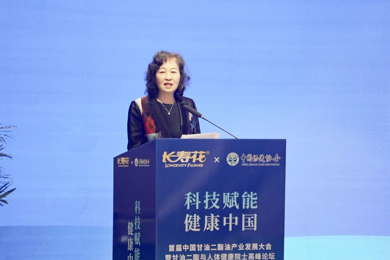 長(zhǎng)壽花食品股份有限公司科研中心總監(jiān)王月華做《長(zhǎng)壽花甘油二酯油技術(shù)研究與應(yīng)用》主題分享