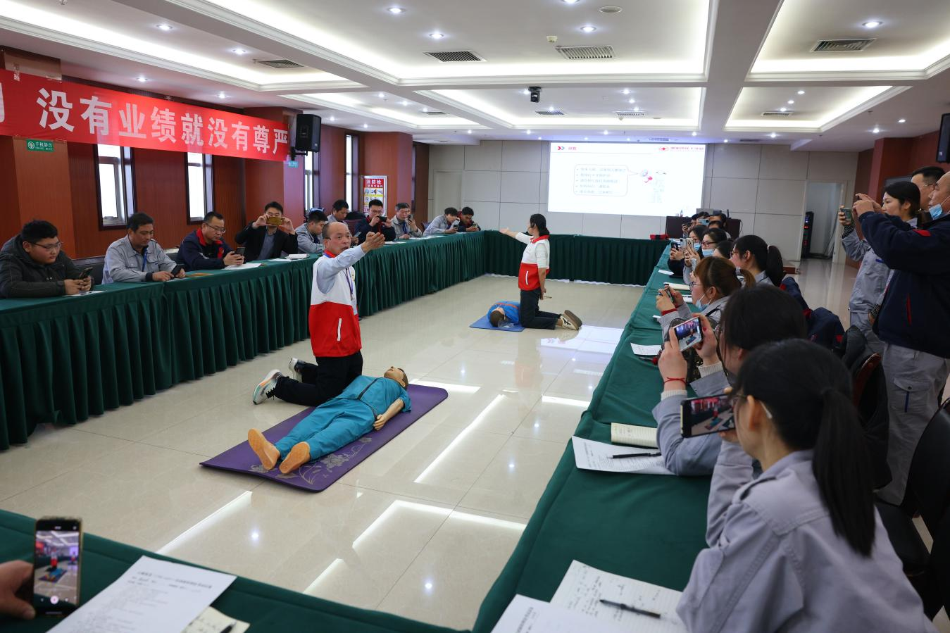 培訓(xùn)中,老師通過淺顯易懂的語言、真實(shí)生動(dòng)的案例,詳細(xì)講解了心肺復(fù)蘇、氣道異物梗阻等常見急癥的處理辦法,并采用理論知識(shí)講解和現(xiàn)場演示相結(jié)合的方式,利用模擬人演示具體急救技巧,手把手指導(dǎo)學(xué)員進(jìn)行實(shí)踐操作。培訓(xùn)現(xiàn)場氣氛熱烈,職工們認(rèn)真聽講,踴躍進(jìn)行實(shí)操練習(xí)。