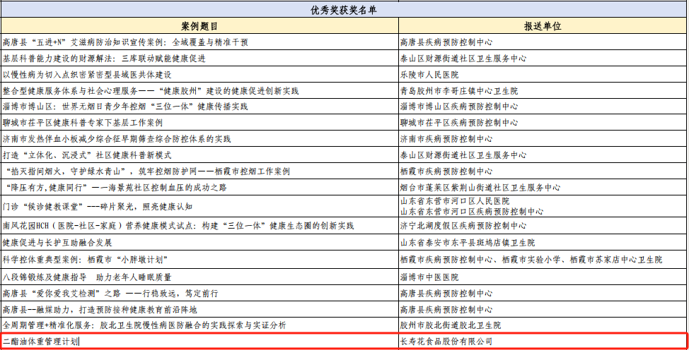 8月2日,第二屆山東省健康促進(jìn)大會(huì)在淄博召開。會(huì)上,長壽花食品《二酯油體重管理計(jì)劃》案例,憑借其突出的創(chuàng)新性與實(shí)效性,榮獲健康促進(jìn)優(yōu)秀實(shí)踐案例。