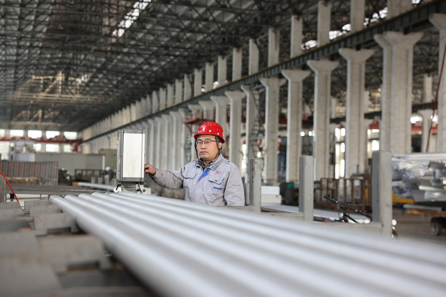 擠壓機(jī)臺(tái)全速運(yùn)轉(zhuǎn),型材淬煉成型